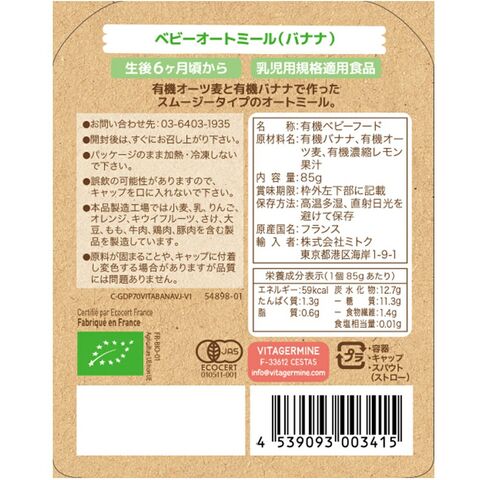 お子様のおやつや離乳食に。 有機オーツ麦と有機バナナで作った、スムージータイプのオートミールです。 原材料の約束事 遺伝子組換え作物の不使用/オーガニック原材料の使用/化学調味料不使用