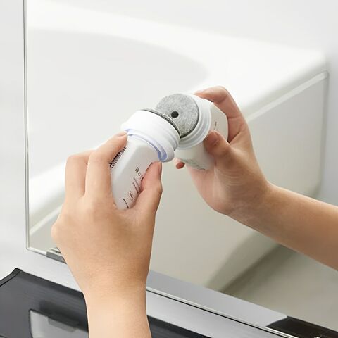 ご使用方法 1:塗布前に鏡をよく洗浄し、乾かすか拭き上げてください。キャップを取りフェルト面を鏡にあて、本体を押して液を出しながら鏡にまんべんなく塗り、良く乾燥させてください。