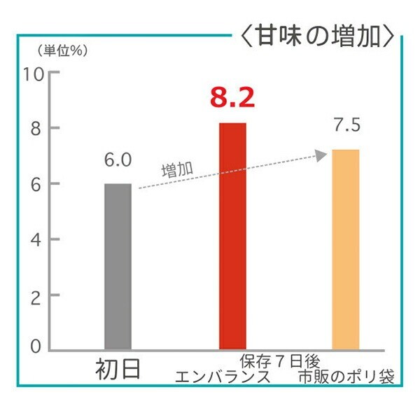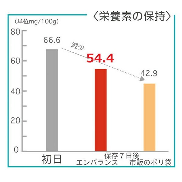 ![]() キウイフルーツでビタミンC測定 エンバランス加工された袋で保存した分は、ビタミンCの減りが少ない。 試験:財団法人 新日本検定協会 ![]() プチトマトで糖度比較 エンバランス加工された袋で保存した分は、糖度が増している。 試験:財団法人 新日本検定協会 ![]() ほうれん草で腐敗の進行比較 緩和時間が長くなるほど腐敗が進んだことを示す。 エンバランス加工された袋で保存した分は、ほとんど変化がなく鮮度をキープ。 試験:ウォーターサイエンス研究会 | |