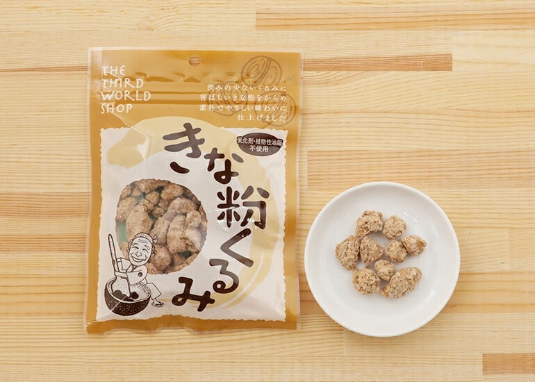 | ■きな粉くるみ きな粉の香ばしい風味とほろりとした食感に、くるみのコクがあわさった「きな粉くるみ」。 きな粉は、遺伝子組み換えでない北海道産大豆を使用。熱風焙煎方式で、芯まで煎り上げ、風味豊かで香ばしい味わいです。白砂糖は使用せず、粗糖と、粗糖と糖蜜を再混合した茶褐色の砂糖を使用しています。また乳化剤などの添加物も一切使用していません。 | |