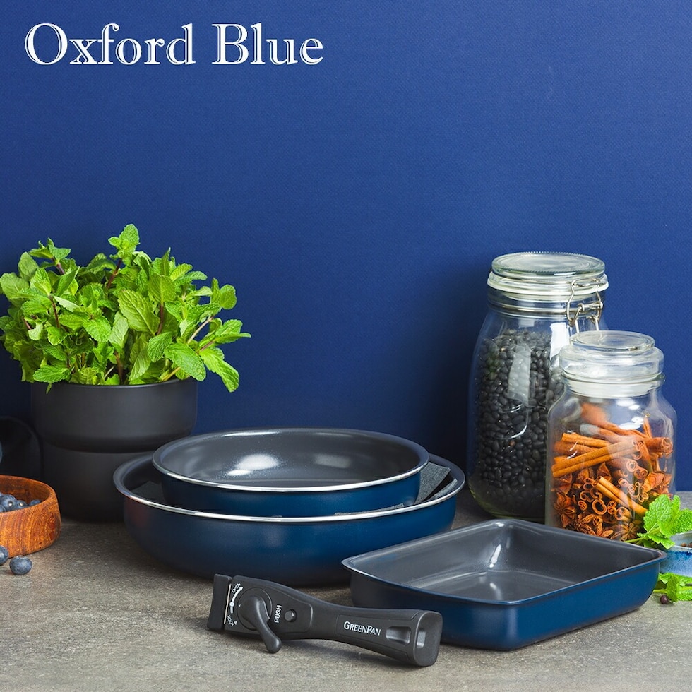 オックスフォードブルー 深みのあるブルーでシックなオックスフォードブルーはどんなキッチンインテリアとも相性のいいカラーリングです。 | グリーンパンを選ぶ理由