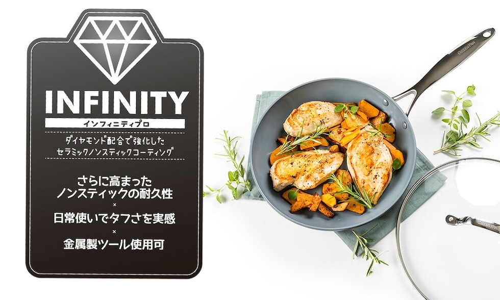 内面のセラミックコーティングにはダイヤモンド粒子を配合し、本体のアルミ素材にはキズや衝撃に強いスクラッチガード加工が施されているので、調理回数が多い方におすすめです。金属ツールもご使用頂けます。