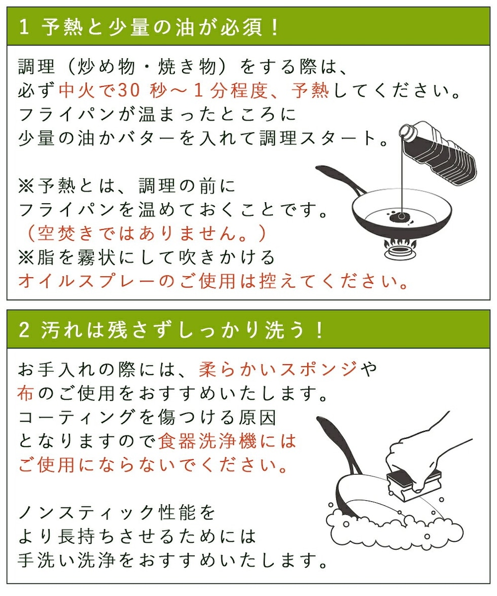 〇フライパンに油をなじませる「油ならし」は必要ありません。調理する際は必ず少量の油を薄くひいてください。