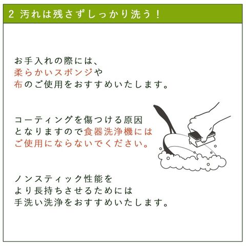 〇柔らかいスポンジや布に中性洗剤をつけてよく洗い、水分を完全に拭き取ってください。火にかけて水分を飛ばさないでください。