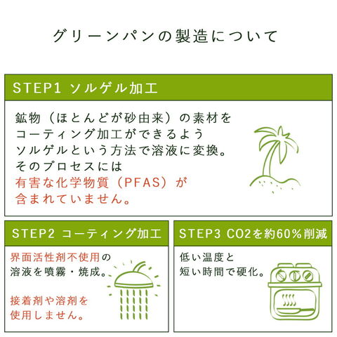 フッ素樹脂を使わないノンスティッククックウェア 2007年、有害なPFASを一切含まない、砂由来と同じ原料からなるセラミックノンスティックコーティング「Thermolon™(サーモロン)」を開発。 Thermolon™(サーモロン)とは 主に砂と同じ成分の原料でできている素材。グリーンパンが特許を取得しているセラミックコーティングです。有害な化学物質が含まれていません。 | グリーンパンの製造について