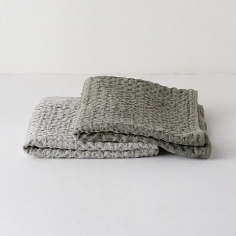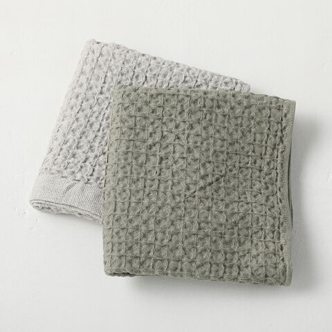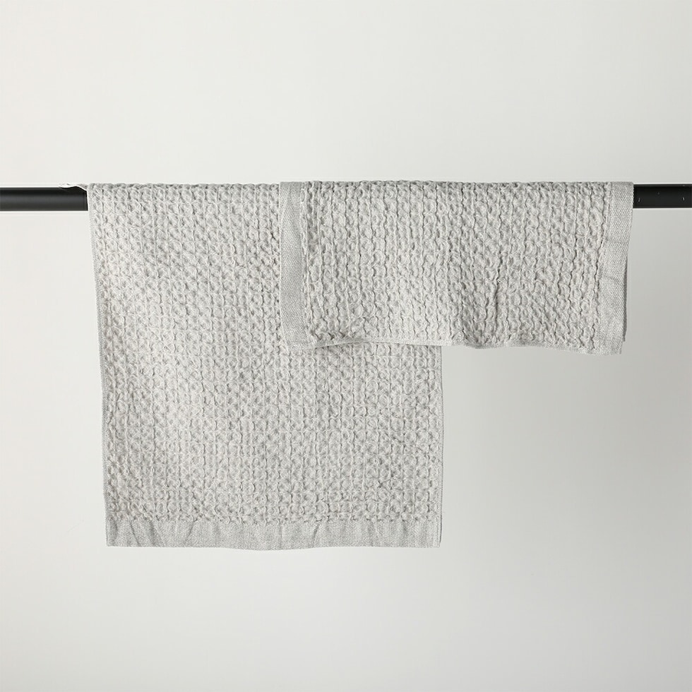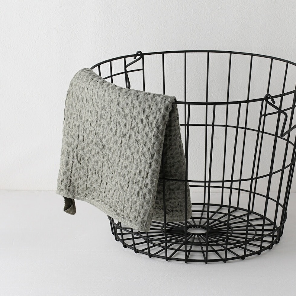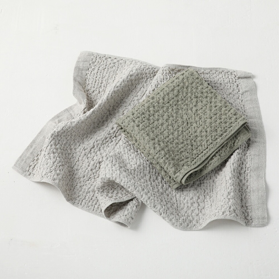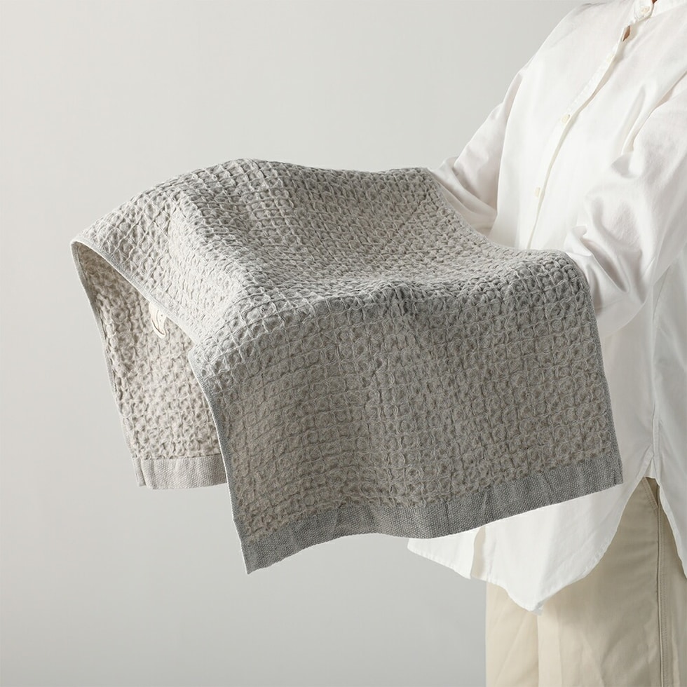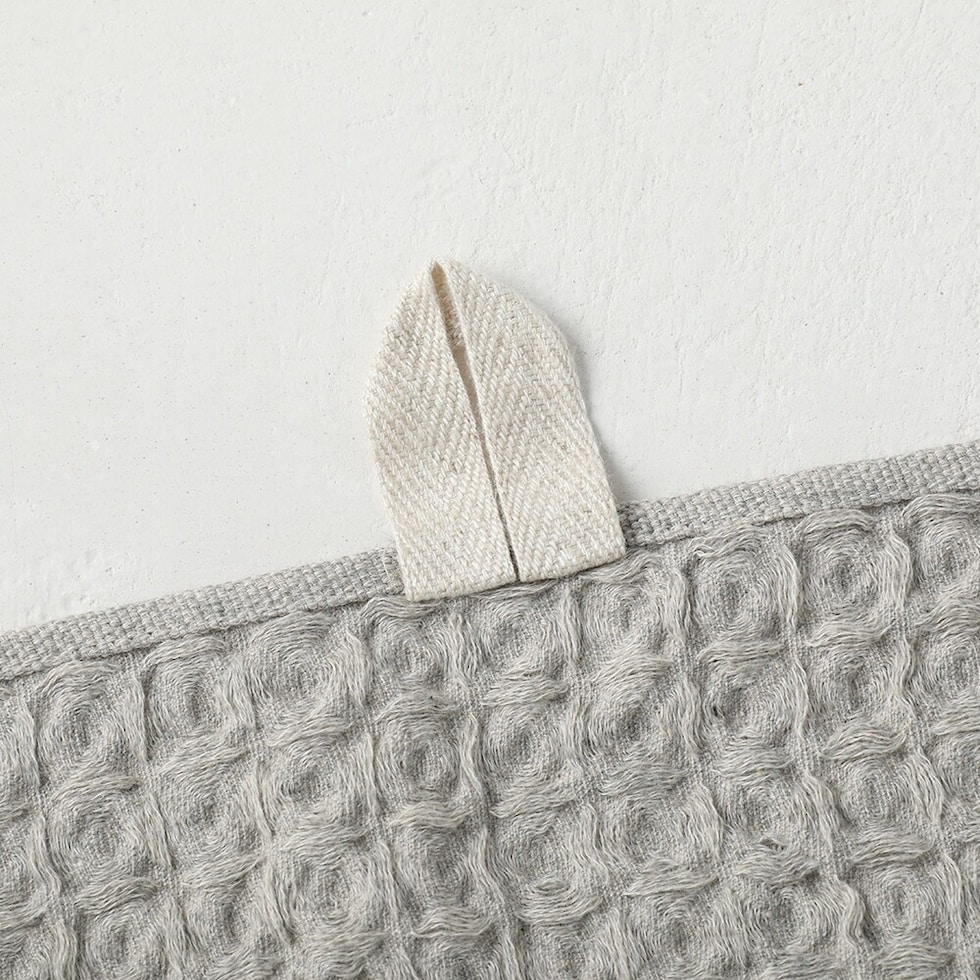 通常のタオルと比べて乾きが早いワッフル織。さらに、天然繊維の中でも吸水・速乾性に優れた麻を30%使うことで乾きも早くなり、イヤな部屋干し臭を軽減できます。 | ループ付き
