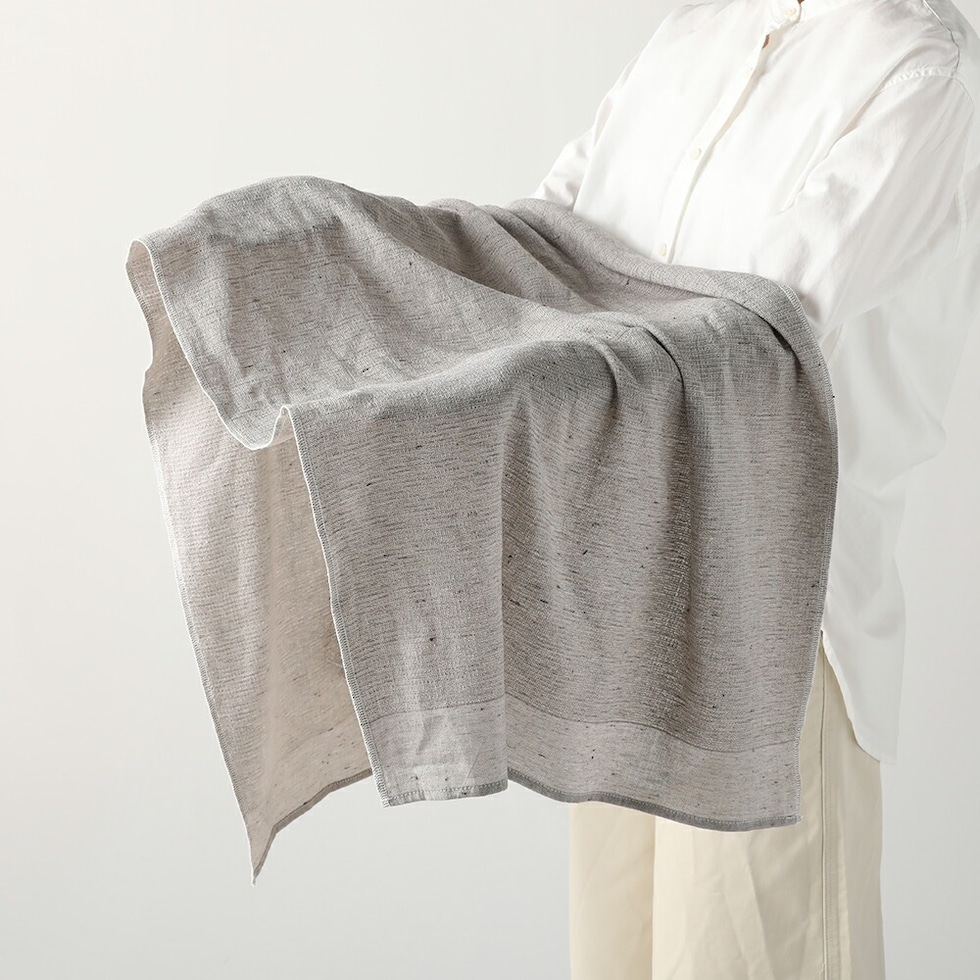 端に施されたロックミシンとロゴマークがさりげないアクセントに。ところどころに顔をのぞかせるネップが、個性的な色味をさらに表情豊かにしています。(全てのカラーでネップをお楽しみいただけます) | 薄くて、軽くて、柔らかい。日常使いに嬉しい機能が揃っています。