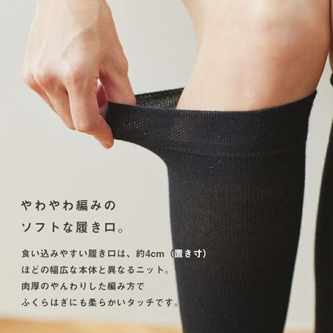 やわやわ編みのやわらか履き口。 食い込みやすい履き口は、約4cm(置き寸)ほどの幅広な本体と異なるニット。肉厚のやんわりした編み方で、ふくらはぎにも柔らかいタッチです。