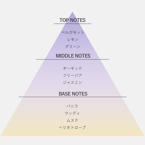 平和と調和をイメージした、 心がささくれがちなときに、そっと優しく包み込むフローラル・バニラの香り。トップノートのベルガモットとレモンが爽やかに香り立ち、グリーンのアクセントが加わり、心を軽やかに。ミドルノートのオーキッド、フリージア、ジャスミンの花々の豊かさを演出し、最後にバニラやウッディ、ムスクが柔らかく包み込みます。穏やかな安心感のある香りで、前向きな気持ちにサポートするフレグランスです。