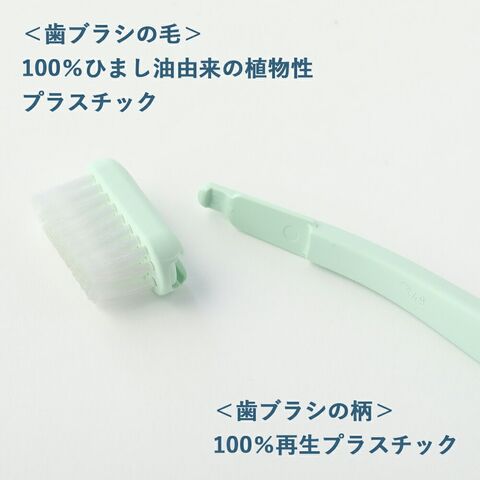 ハンドルは100%再生プラスチック、ブラシの毛は100%ひまし油由来の植物性プラスチックを使用し、環境保護に貢献。