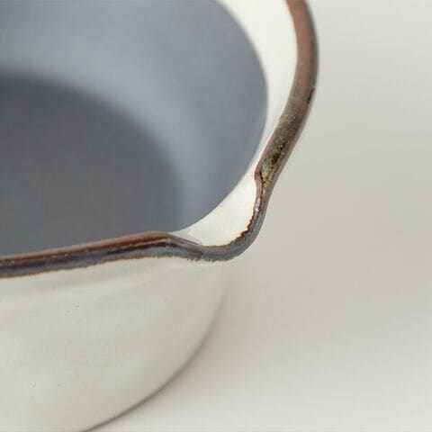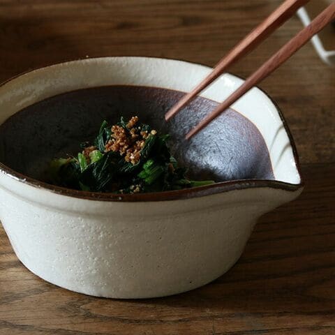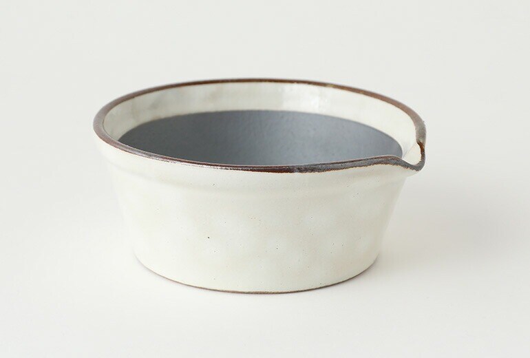 ![]() 器としても使える溝のないすりバチと 専用すりコギのセット。 かもしか道具店 すりバチ(白/藍)+ すりコギ 【セット】 三重県の萬古焼の技術をいかした食器や食に関わる道具を作る「かもしか道具店」のすりバチとすりコギ。 溝のないすりバチの、溝の代わりとなるのはざらりとした焼き締めの土肌。 ゴマを擦っても溝にたまらないので、残さず使えて洗い物も減らせます。 すりたての素材とお野菜などを器のなかで直接和えて、そのまま器として食卓に出してもさまになります。 また土台に重心を置いた構造・縦横比を工夫したため、安定感もバツグン。 縁を持たず、両手で丁寧にゴマが擦れます。 すりコギは、このすりバチの局面に合うよう、何度も試行錯誤してできたもの。 目の細い朴(ほお)の木を使用しているので、擦る素材にやさしくあたり上手に擦れます。 ≫ 【単品】すりバチ はこちら ≫ 【単品】すりコギ はこちら |