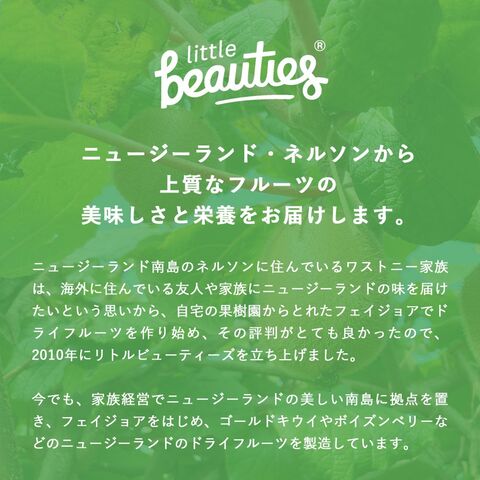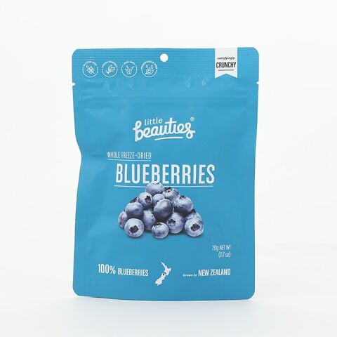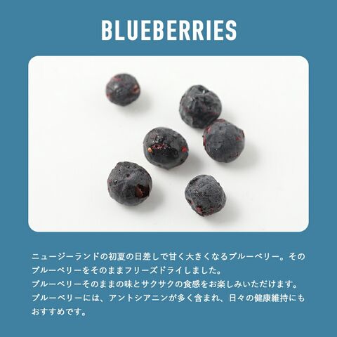ニュージーランドの上質フルーツをフリーズドライ。 ニュージーランド南島のネルソンに住んでいるワストニー家族は、海外に住んでいる友人や家族にニュージーランドの味を届けたいという思いから、自宅のフェイジョア果樹園からとれたフェイジョアでドライフルーツを作り始め、その評判がとても良かったので、2010年にリトルビューティーズを立ち上げました。 | ブルーベリー
