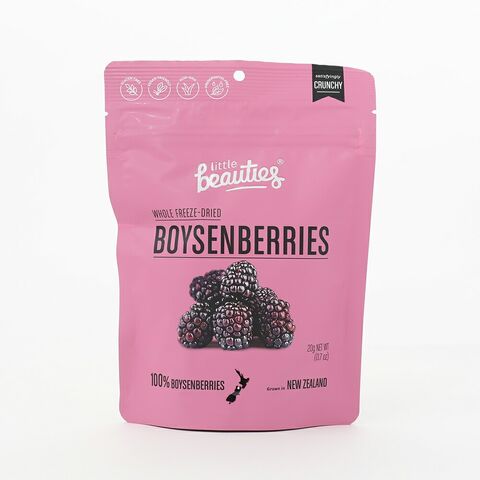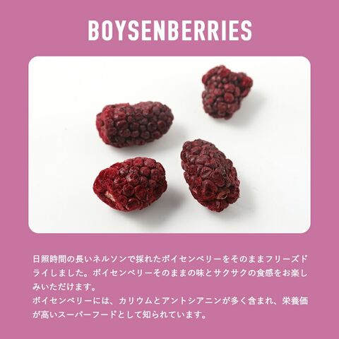 日照時間の長いネルソンで採れたボイセンベリーをそのままフリーズドライしました。ボイセンベリーそのままの味とサクサクの食感をお楽しみいただけます。ボイセンベリーには、カリウムとアントシアニンが多く含まれ、栄養価が高いスーパーフードとして知られています。