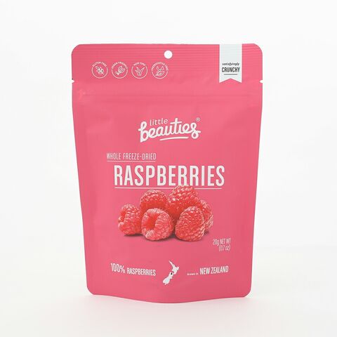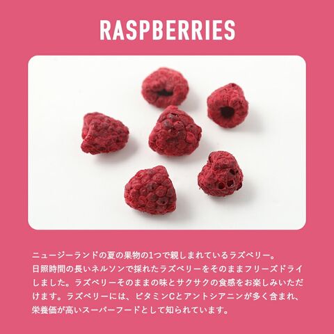 ニュージーランドの初夏の日差しで甘く大きくなるブルーベリー。そのブルーベリーをそのままフリーズドライしました。ブルーベリーそのままの味とサクサクの食感をお楽しみいただけます。 | ラズベリー
