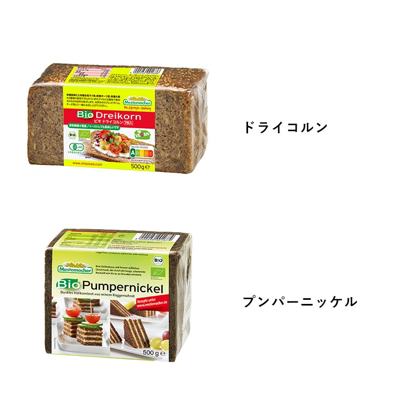 【ドライコルン / 3種穀物&亜麻仁(アマ二)ブレッド】 ・オメガ3が豊富な亜麻仁を配合 ・そのままスナックとして ・サーモン&クリームチーズ、卵と ・ハムやチーズなど様々なトッピングと一緒に 【プンパーニッケル / ライ麦ブレッド】 ・サンドしやすい厚み ・そのままスナックとして ・ハムやチーズなど様々なトッピングと一緒に | |||||||||||||||||||||||||||||||||||||||||||||||||||||||||