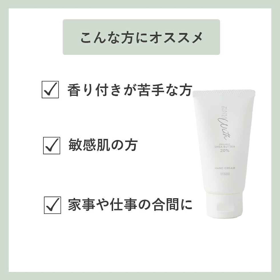 ●オーガニックシアバター*20%配合 乾燥した手肌に、濃厚な潤いを。 オーガニックシアバター*20%と高配合だから、シアの潤いが角質層まで浸透し、カサつく手肌をしっとりなめらかに。 爪や爪周りなど、乾燥が気になるところの保湿ケアにもおすすめです。 *シア脂(天然由来保湿成分)●仕事中や家事の合間にも しっとり、なのにべたつかない仕上がり ベタつかず、さらりとした使い心地で、忙しい日々でもサっと保湿ケアが可能。 家事の合間やお仕事中でも、ベタつきを気にせずに心地よくお使いいただけます。 ●天然由来成分98%。 自然の力で優しく、潤う肌へ 毎日肌に触れるものだからこそナチュラルに。天然由来成分98%のシンプルな処方で、肌に負担をかけず、しっかりと保湿します。 自然のもつ力で、敏感なお肌もやさしく包み込む、ピュアなスキンケアタイムを。