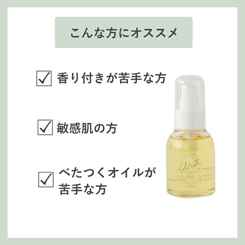 ●軽めの使用感で肌なじみが良い、オーガニックシアオイル*配合 オーガニックシアオイル*10%配合。シアオイル*は、シアバターと比べて軽めのテクスチャーで、肌になじみやすく、べたつきが少ないのが特徴です。 お肌にスッと浸透して伸ばしやすいので、広範囲へのご使用やマッサージなどに最適です。 *シア脂油(天然由来保湿成分)●全身の保湿ケアがこれ1本でOK。様々な用途で使用できるマルチオイル オイル特有のべたつきがなく、全身に使いやすい肌なじみの良いテクスチャーなので、ボディだけでなく、フェイスやヘアにも使えるマルチオイルとして、ご使用いただけます。また、天然成分で刺激が少ないため、敏感肌の方や赤ちゃんにも使いやすいオイルです。 ●天然由来成分99%。 自然の力で優しく、潤う肌へ 毎日肌に触れるものだからこそナチュラルに。天然由来成分98%のシンプルな処方で、肌に負担をかけず、しっかりと保湿します。 自然のもつ力で、敏感なお肌もやさしく包み込む、ピュアなスキンケアタイムを。