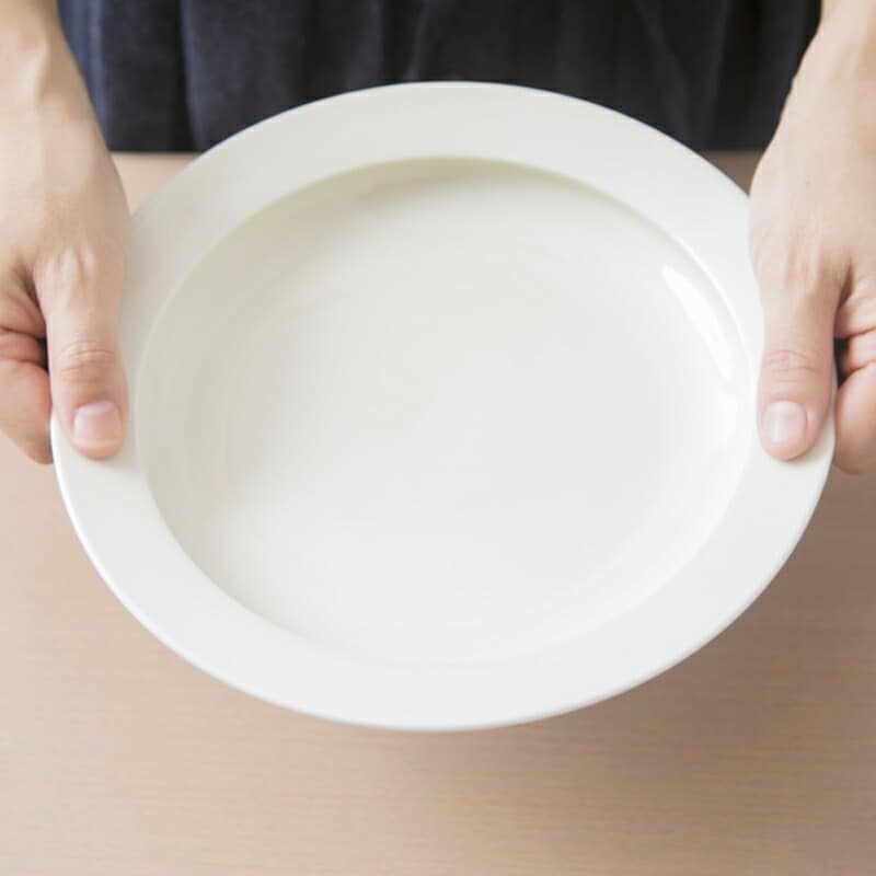 ![]() カレーやチャーハン、パスタなどの料理にちょうどいい22.6 × 3.8cmサイズ。また600gと重めなので、食事中にプレートを押さえられなくても、すぐに動いてしまわないところもポイントです。 ![]() お皿の縁の内側に返しがつけられているので、スプーンで簡単に料理をすくうことができます。これなら、もどかしい最後の一口ももどかしい最後の一口もスムーズにすくえて、気持ちよく食事を終えられますね。 ![]() 外側に広がった縁のおかげで、ストレスを感じずにお皿を移動できます。 ![]() 食事中もすっと手を添えやすいように、お皿の高さにもこだわっています。 | |||||||||