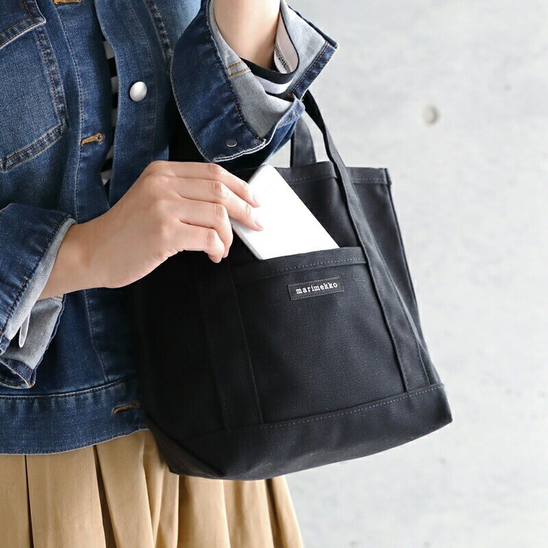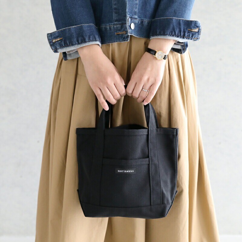 | マリメッコらしいモードな雰囲気漂うミニトートバッグです。 手に馴染む小ぶりなハンドルに、使い勝手の良いスマートなサイズ感で「ちょっとそこまで」のお出かけにぴったり。大きなマチがあるので、見た目以上の収納力で自立も可能。サブバッグとしても重宝しますよ。 丈夫なコットンキャンバス地を使用しているので、毎日のお出かけにも気軽に使えて、長く愛用して頂けます。 フロントポケットのブランドタグがアクセントになっていて、シンプルなデザインなのでプレゼントにもおすすめです。 トップ写真 : ブラック(99) | ||||||||||||||