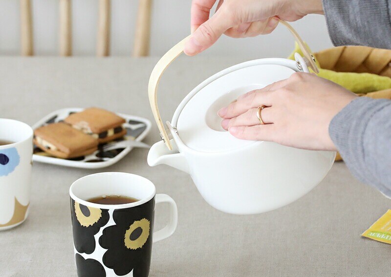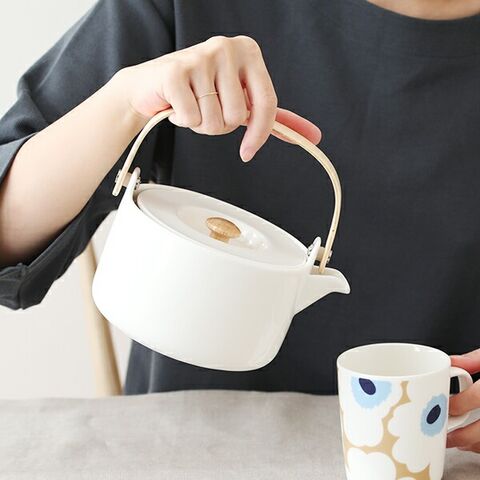 | 北欧フィンランドを代表するテキスタイルブランド「marimekko / マリメッコ」。大胆で大胆で鮮やかなテキスタイルが多いマリメッコの中でOIVAティーポットはとってもシンプル。木目のハンドルと蓋の取手にホワイトカラーの磁器の組み合わせがナチュラルで、北欧らしい雰囲気です。 シンプルでやわらかいフォルムは、どこか素朴で温かみのある味わい。 和・洋どんな食器とも相性がよく、食卓に自然になじみます。茶こしが付いているので、お手入れしやすく使い勝手◎。容量もたっぷりの700mlです。 |