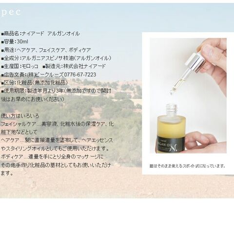 | ■商品情報 モロッコだけに育つアルガンの木の実から抽出した、ピュアなアルガンオイル(肌を滑らかにする)がナイアードからついに登場です。 オリーブオイルの約2倍とも言われるビタミンEや、シアバター(保湿)などにも含まれ、肌をイキイキとさせるトリテルペンアルコールなど、肌にうれしい成分がギュッとつまった「モロッコの黄金」、アルガンオイルを、現地の自社公房で熟練のスタッフの手でていねいに搾油しました。 シンプルで良質なアルガンオイルは、角質層へすっとなじみ、お肌をもっちりみずみずしく整えます。 さらりとした使用感とフルーティな香りが心地よい、アルガンオイルそのものの効果を実感してください。 ■区分:化粧品 ■製造元:株式会社ナイアード ■生産国:モロッコ ■広告文責:(株)エル・ローズ TEL0120-291-410 |