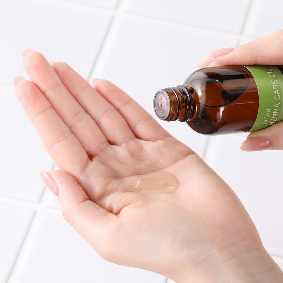 ヘナ染め後をさらに心地よく、指通りなめらかな仕上がりに。 ヘナ染め後に感じるキシミ、ごわつきに。 |こだわりの自然素材 ●アルガンオイル(アルガニアスピノサ核油) モロッコにある自社工房内で丁寧に低温圧搾したアルガンオイルを贅沢に配合しました。 ●オリーブオイル(オリーブ果実油) モロッコにある自社工房内の農園にて無農薬栽培されたオリーブオイルを使用しています。 ●グレープシードオイル(ブドウ種子油) ベタつきが少なく、さっぱりとして伸びのよい植物オイルで、「ヘナケアオイル」の使用感を特徴づけています。 | 使用方法
