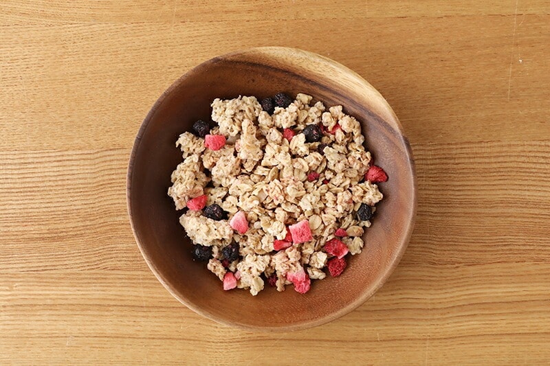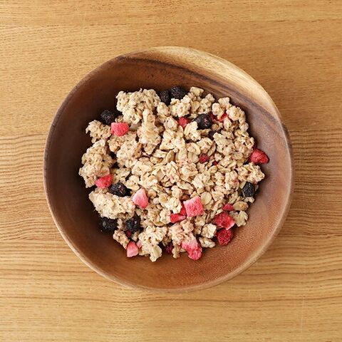 完熟の有機ストロベリー、ラズベリー、ブルーベリーの甘みと酸味がヨーグルトチャンクと調和した美味しいグラノーラです。おいしさを閉じ込めるため、完熟フルーツはフリーズドライに。 | |||