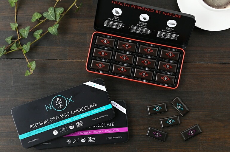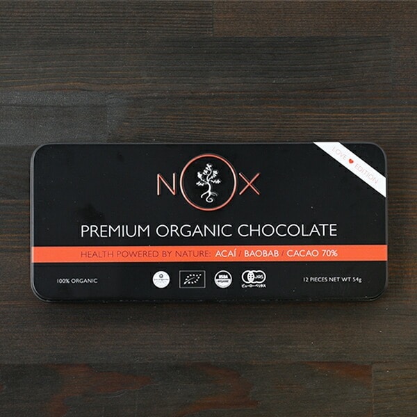 食べないより食べたほうがいいチョコレート スウェーデン生まれのチョコレートブランド"NOX ORGANICS"。有機カカオマス、有機ココナツシュガーを使用し芳醇なカカオの香りと味わいを損なわず、スーパーフルーツの栄養成分をギュッと閉じ込めました。NOXという名前はラテン語で「夢」や「夜」という意味をもっており、100%ナチュラル&ラグジュアリーな味わいを楽しめます。 | ||