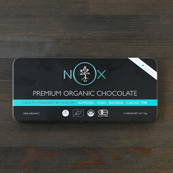 ノックス(NOX)のチョコレートは、トランス脂肪酸・乳製品・白糖を使用せず、100%オーガニック原料だけで作られた上品な味わいが広がるダークチョコレートです。カカオ70%含有のチョコレートは、ほろりと感じる苦味が特徴。その中に話題の"スーパーフルーツ"を加えることで、ナチュラルでフルーティーな味わいをプラス。甘くて美味しいチョコレートをサプリメント感覚で召し上がれます。 高級感ある缶のケースは大切な人へのプレゼントやギフトにピッタリ。糖質制限をされている方や罪悪感なく甘いものを召し上がりたい方にも◎。蓋を開けた瞬間、広がるチョコレートとバニラビーンズの上品な香りが食欲をそそります。 ラインナップは全部で3種類あります。それぞれアサイー、バオバブ、チアシードなどのスーパーフルーツを配合。スウェーデン生まれの体に優しいチョコレートをご体感ください。 ▼有機JAS / EU認証 / USDA認証 / bio. inspecta認証 / 取得 | ||