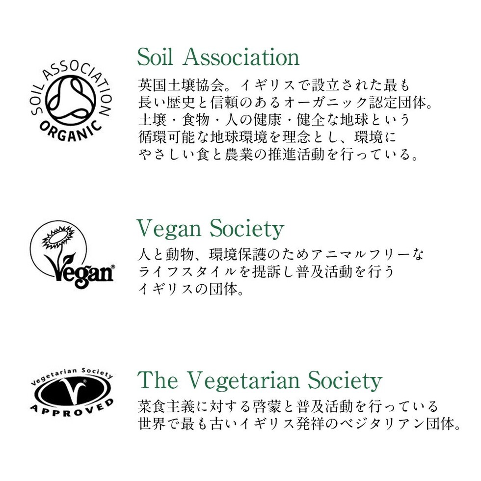 イギリスで最も長い歴史と信頼を誇る認証機関『英国土壌協会(Soil Association)』等の厳しい基準をクリアした認定オーガニック原料を主に使用しています。 以下の原料を使用しておりません。 ・遺伝子組み換え原料 | ご使用方法