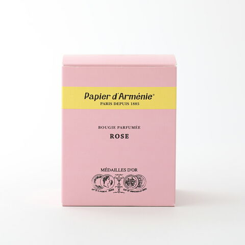甘く優しいローズの香りのアロマキャンドル フランスで120年の歴史のある紙のお香「papier d'armenie(パピエダルメニイ)」の特製キャンドルは、紙のお香にも負けない上質な香りでリピーターの多いアイテム。火をつけなくてもほのかな香りが漂います。 | LINEUP 紙のお香シリーズ