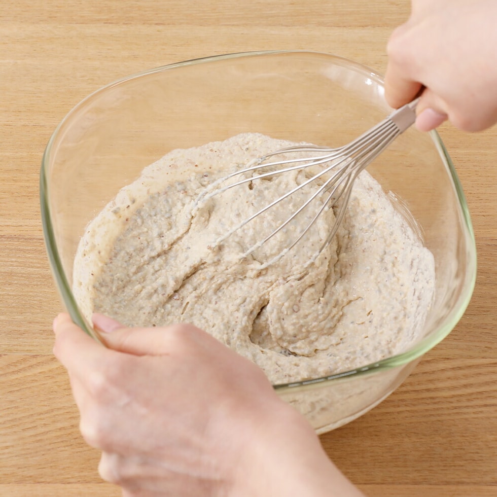 基本のパンケーキの作り方 1.パンケーキミックス(1袋100g)にお好みのミルク(150ml)、メープルシロップ(大さじ1)を加え、よく混ぜます。