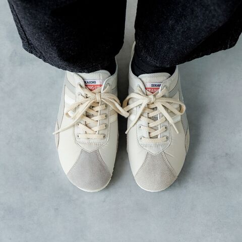 7mm幅のキナリのコットンシューレースが、レトロな雰囲気を演出しています。