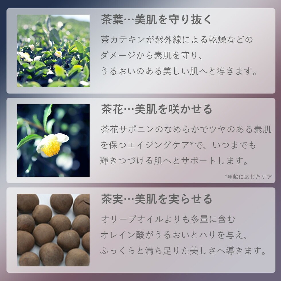自然のエネルギーの調和を美しい肌バランスに生かすため、大和茶のオールシーズンの恵みをたっぷり配合しました。