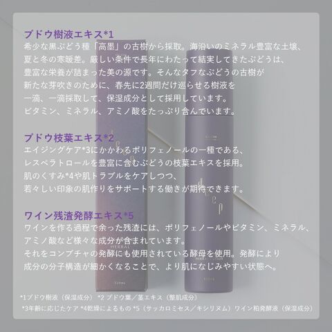 *1ブドウ樹液(保湿成分) *2 ブドウ葉/茎エキス(整肌成分) *3年齢に応じたケア *4乾燥によるもの *5(サッカロミセス/キシリヌム)ワイン粕発酵液(保湿成分)