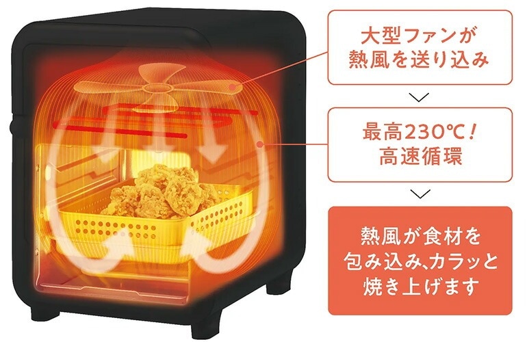 | 「油で揚げない揚げ物」をおいしく食べられる エアーオーブン機能は、最高温度230℃の高温の熱風が油の代わりに食材を包み込むイメージです。食材が持っている油と水分で調理します。温度をセットすれば庫内の温度管理はお任せでOK。面倒な揚げ油の準備や後処理も不要です。さらに、余計な油も落としてくれるので罪悪感なく揚げ物を食べることができます。 | |