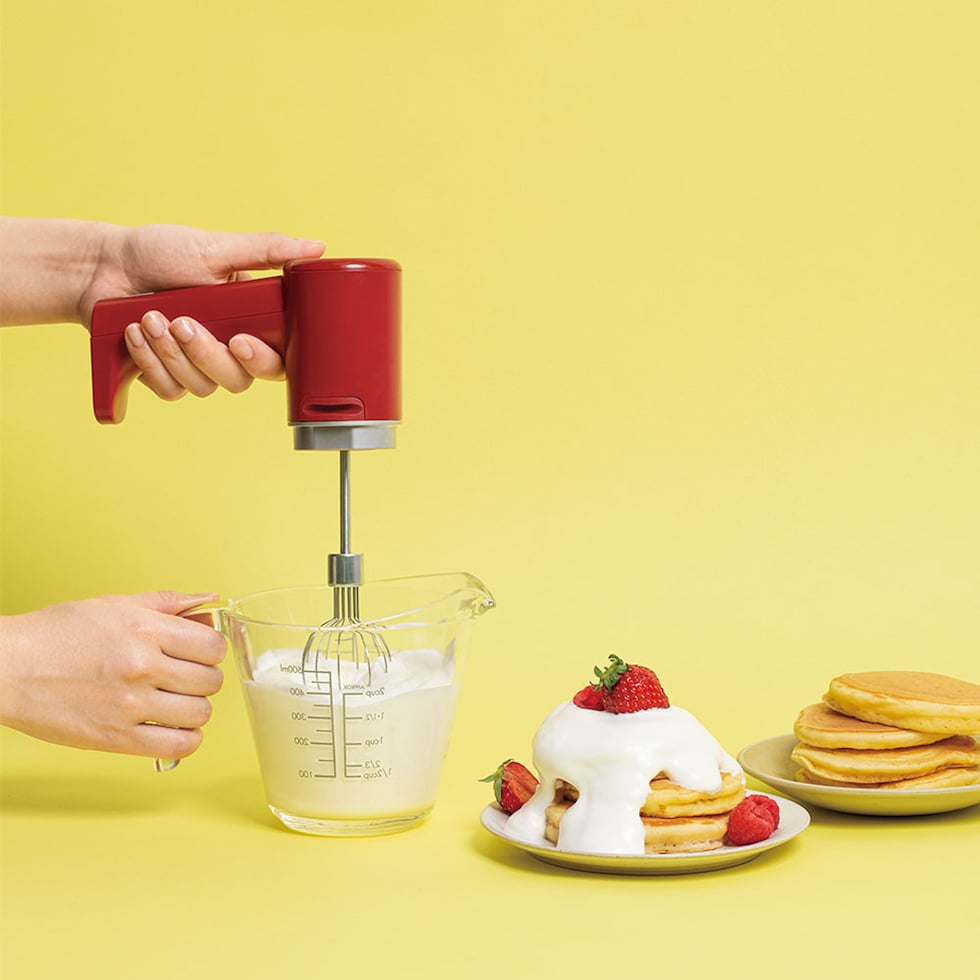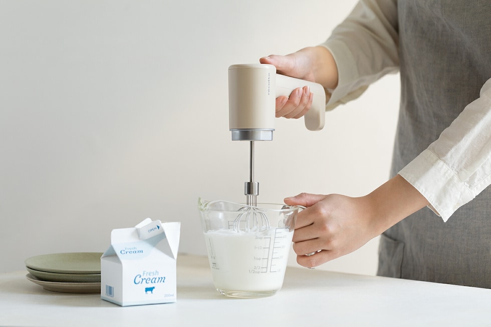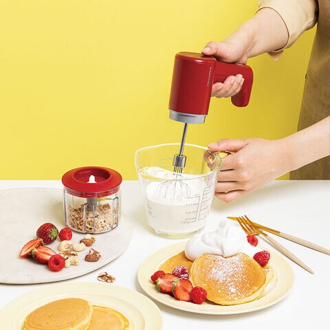 泡立てもみじん切りもあっという間! 生クリームや卵白などの泡立て器(ホイッパー)と、食材のみじん切りが簡単にできるフードプロセッサーが1台にまとまりました!コードレスのため、場所を選ばずお手軽にご使用いただけます。 | ホイッパー:泡立て