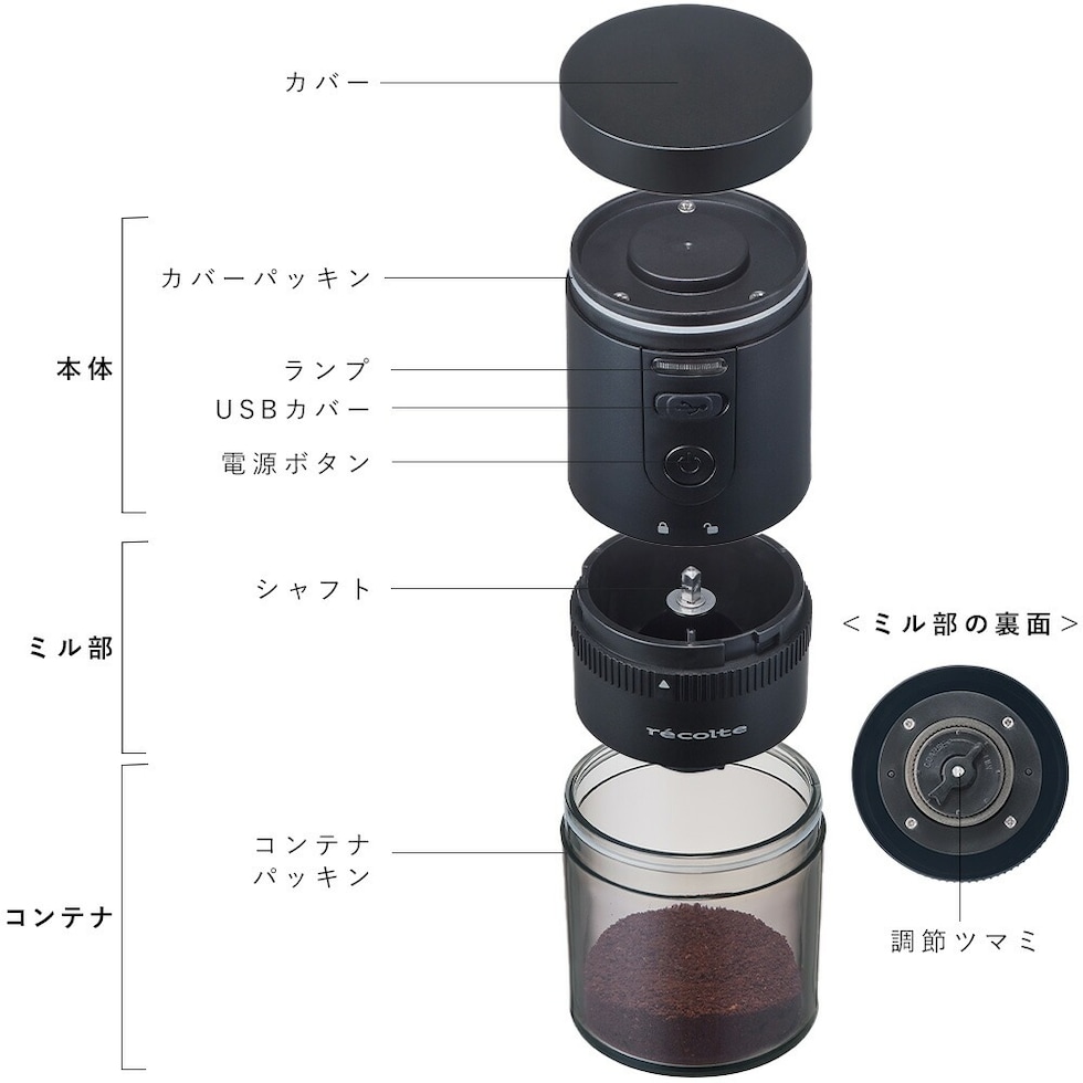 recolte(レコルト)Cordless Coffee Grinder コードレス コーヒーグラインダー ホワイト RCM-3(W) ブラック RCM-3(BK) アウトドア ビギナー コーヒー豆 コンパクト 充電式 持ち運び コーヒーメーカー ホームコーヒー 珈琲