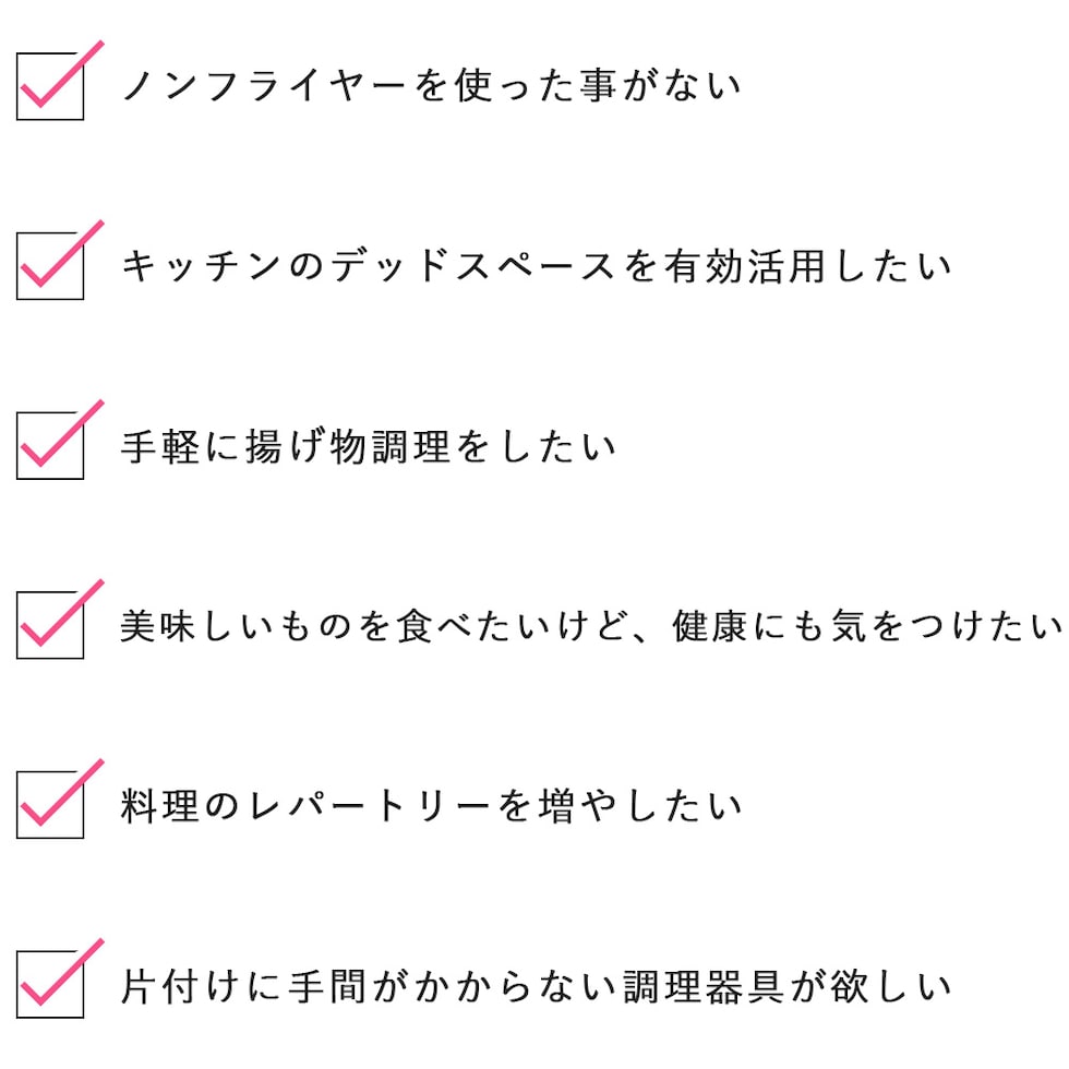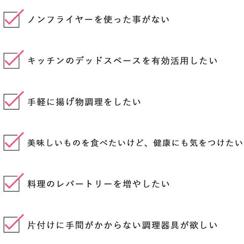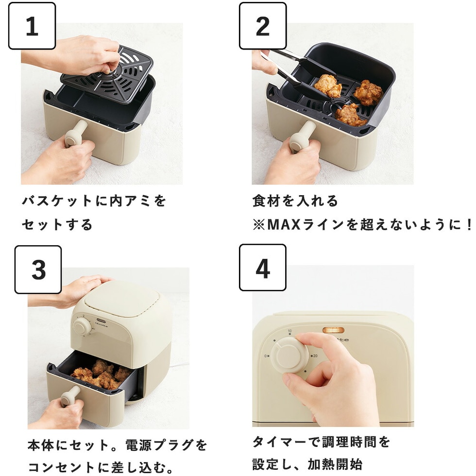 揚げ物調理だけでなく、オーブンの様に“焼く”調理はもちろんのこと、揚げ物の温め直しができるのもエアーオーブンミニの魅力。お惣菜の温めなおしは特におすすめで、天ぷらやコロッケを温めなおすと包丁で切るとザクッと音がするくらいカラッと仕上がります。 | スペースをとらない、コンパクト設計