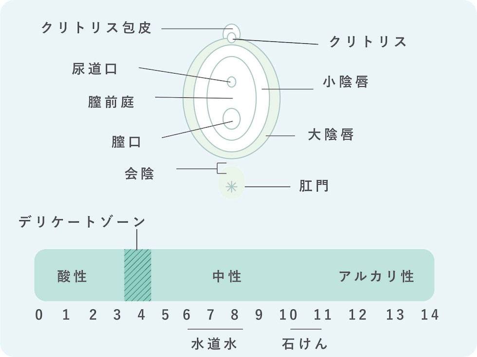Qデリケートゾーンのケアは必要? A年齢を重ねたり、日々忙しく過ごしたりして、デリケートゾーンのうるおいは失われがち。デリケートゾーンを清潔に保湿し、健やかに整えることは、肌にうるおいを与えてくれます。 Qどこをどのようにケアしたらいい? Aデリケートゾーンのケアは、小陰唇より外側(下図参照)を丁寧に洗い、保湿します。必ず粘膜部分を避けて行います。 デリケートゾーンはPH値が3.8~4.5とされていますので、ソープやミルクなどはデリケートゾーン用のものを使いましょう。 |