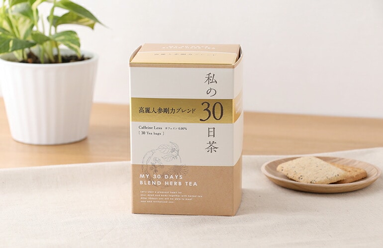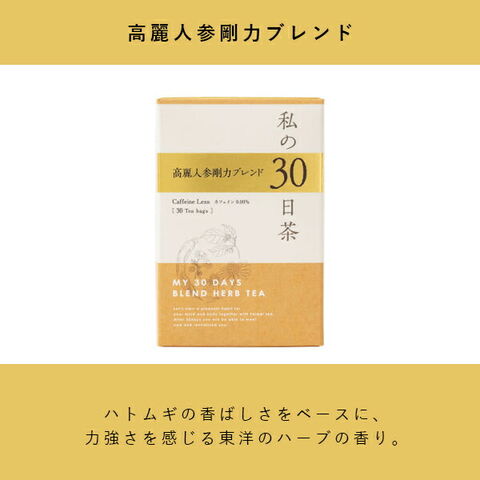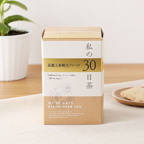 ![]() 1日1杯で気持ちのいい習慣を。 力強さを感じる高麗人参のハーブティー。 1日1杯のハーブティーで、心と体に気持ち良い習慣を30日間から始めていただくためのハーブティーシリーズ「私の30日茶」の高麗人参剛力ブレンドです。 ハトムギの香ばしさをベースに、力強さを感じる東洋のハーブが香り、クセが少なく、飲みやすいハーブティーです。 昔から健康維持に役立つとして珍重されてきた高麗人参やレイシに加え、ペルーの高山地帯にある過酷な環境下で育ったマカ、ゴジベリーといったスーパーフードなど全20種をブレンドしました。 仕事や家事など、忙しい毎日を送る方にオススメです。 携帯に便利な個包装タイプのため、1日に複数召し上がる方やオフィスや旅行先でも取り入れやすいです。 カフェインレス(無水力カフェイン0.00g)*商品のため、カフェインが気になる方にも。 自分に向き合う少しだけ丁寧な習慣の一つに「私の30日茶」を始めてみませんか? ※本製品で使用のマテグリーンには ![]() |