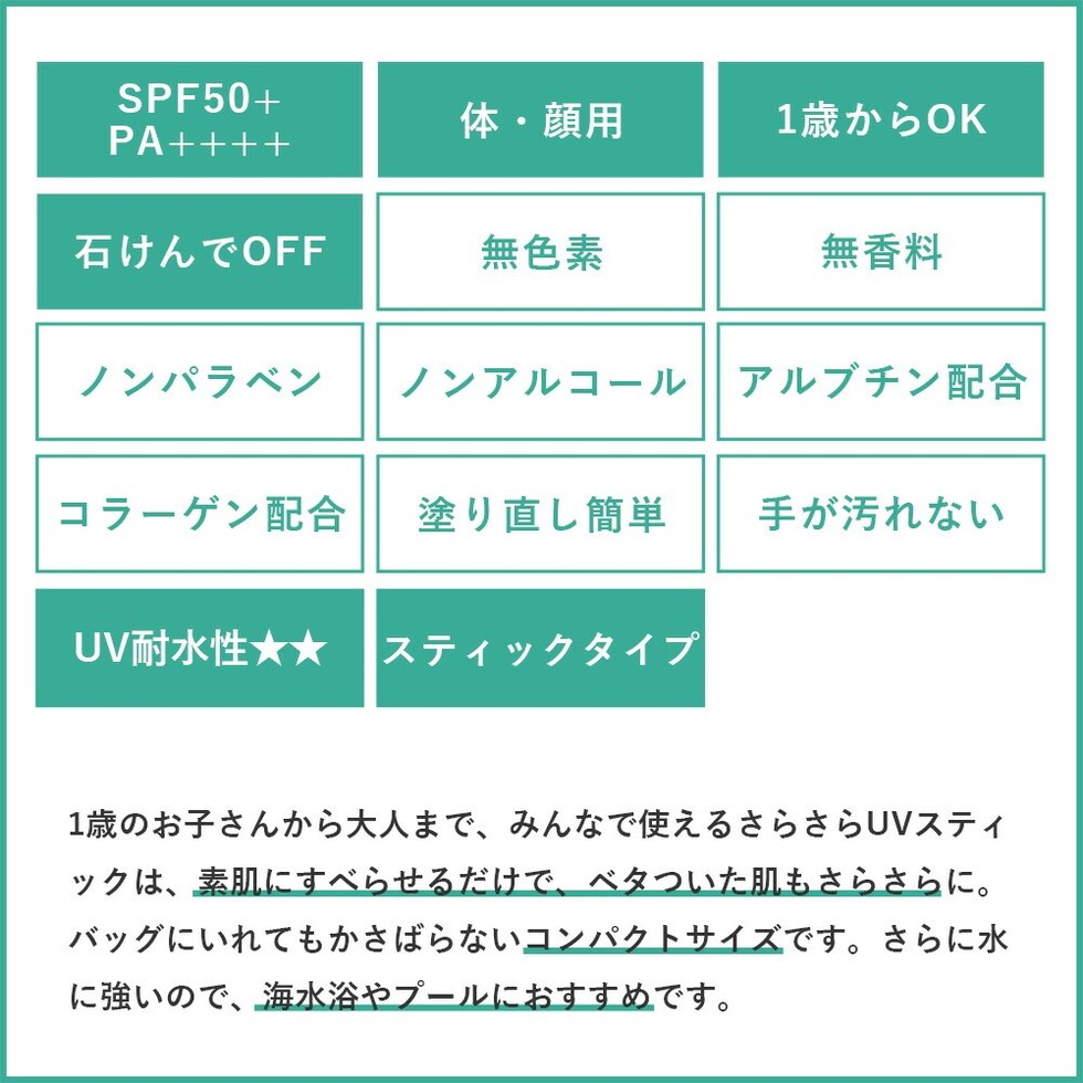 1歳から使用できるスティックタイプの日焼け止め。最大の特徴は、外出先でも手を汚さずに簡単に塗り直しができること。顔にも体にも直塗りできるので、テカテカ汗ばむ首の後ろや、サンダル焼けがこわい足の甲まで、塗りにくいパーツもスマートかつ簡単にUVケアができます。さらにベタついた肌をサラサラにする軽いつけ心地は、大人はもちろん子どもにも大人気です。また、SPF50+に加え、「UV耐水性試験」でUV耐水性★★を取得。水に強いので、海水浴やプールといった夏のイベント時にもおすすめです。