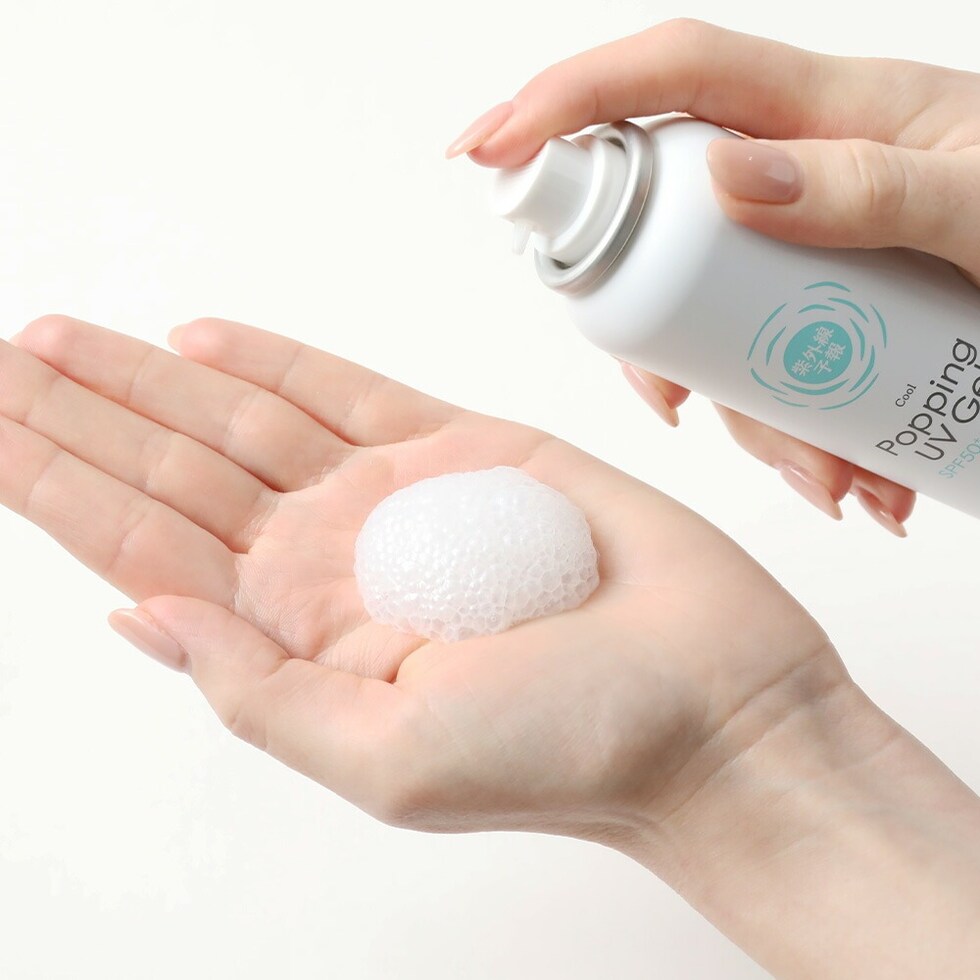 パチパチ泡がひんやり涼やかにする。 1歳から使用できる泡状の日焼け止め。紫外線と纏わりつくような暑さが気になる日にピッタリのアイテムです。肌に馴染ませると、パチパチと音をたてながらシュワーッと伸びて肌に密着。軽いつけ心地でベタつきもなく、ひんやりと肌を涼ませます。パチパチと弾ける「音」、ひんやりとした「触感」、ほのかに香るオレンジ精油の「香り」で気分もリフレッシュできる、まさに一石三鳥のUVケアアイテム。家族みんなでユニークな日焼け止めの楽しさを共有できます。
