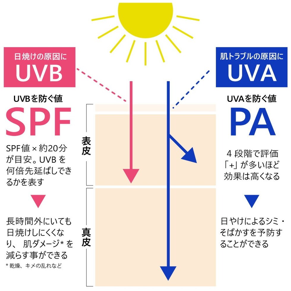 シミの原因となるUVBとUVA。 UVB:肌が赤くヒリヒリする日焼け、新しいシミや乾燥の原因にも。 | ポイント