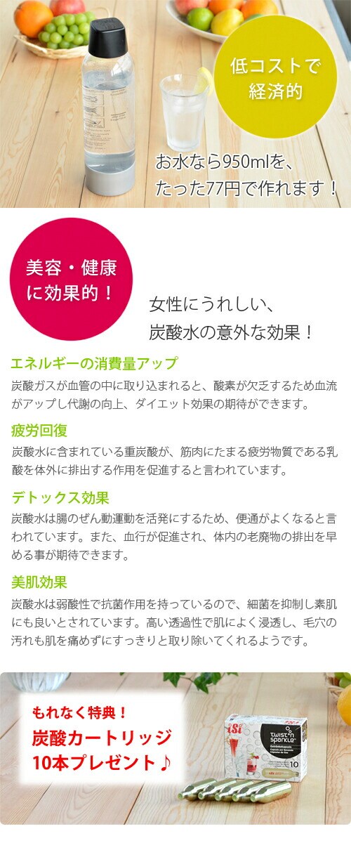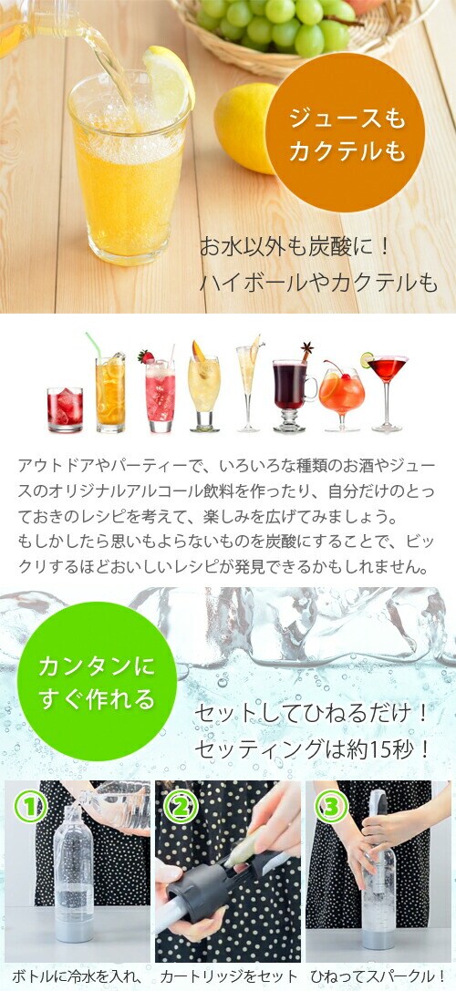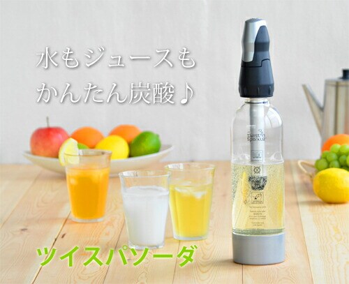| 「ツイスパ ソーダ」は、セッティング約15秒で普通の水を炭酸水に変身させるヨーロッパ(オーストリア)生まれの炭酸水製造マシンです。 ご家庭で水やジュース、アルコール飲料などを簡単に炭酸飲料にすることができます。 フレッシュジュースやオーガニックのシロップを使って、自分だけのソーダを作ったり、フルーツジュースを水やストレート・アイスティーで薄めて、炭酸を入れれば、低糖分・低カロリーの健康ジュースが作れます。 またアウトドアやパーティーでいろいろな種類のお酒やジュースでオリジナルのアルコールを作ったりと、幅広くご利用いただけます。 |