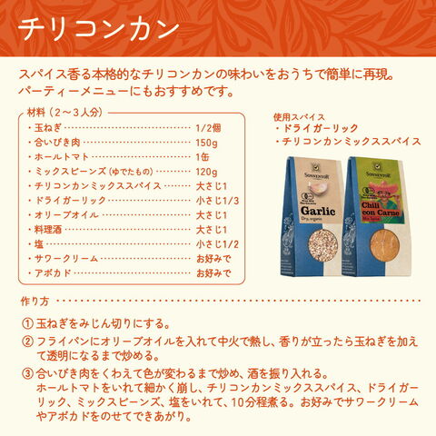 ピリ辛&ハーブがクセになる。 チリコンカンの仕上げはこれで決まり!ハーブ、野菜、スパイスを組み合わせて、本場メキシコの家庭の味を再現しました。スパイスの奥深さとピリ辛がクセになります。