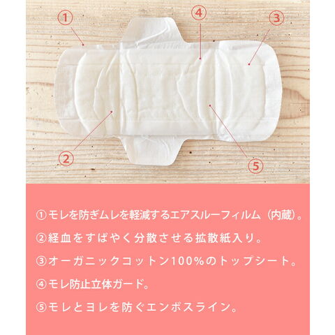 | 1.オーガニックコットン 肌に触れるトップシートにはオーガニックコットンを100%使用。 2.高分子ポリマー不使用 石油化合物である吸収性ポリマー(高分子吸収材)は不使用。天然素材にこだわり、植物由来のセルロースパルプのみを使用しています。 3.酸素漂白 人体にも安全で環境負荷も低い漂白方法。 4.エコテックス規格100 繊維商品の品質を審査する国際規格のクラスI認証を取得。 5.日本製 不織布から最終製品に至るまで安心の日本製。 6.ナチュラルな使い心地 ふんわり柔らかなオーガニックコットンの肌ざわりと、布ナプキンのようなふっくらとしたつけ心地です。 | ||||||||||||||||