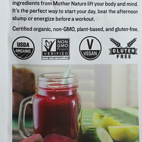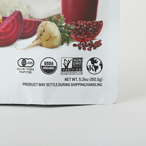 全成分:有機ビーツ末、有機ザクロジュース末、有機冬虫夏草末、有機ヤマブシタケ末、有機りんごエキス末、有機りんご末、有機マカ末、有機ココナッツウォーター末、有機レモン末/増粘剤(アラビアガム、グァーガム)、甘味料(ステビア)