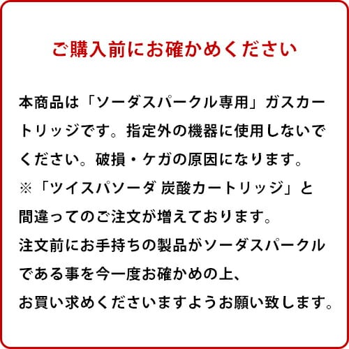 メーカー保証の対象外となりますので、純正品の「ソーダスパークル ガスカートリッジ」以外は絶対に使用しないでください。