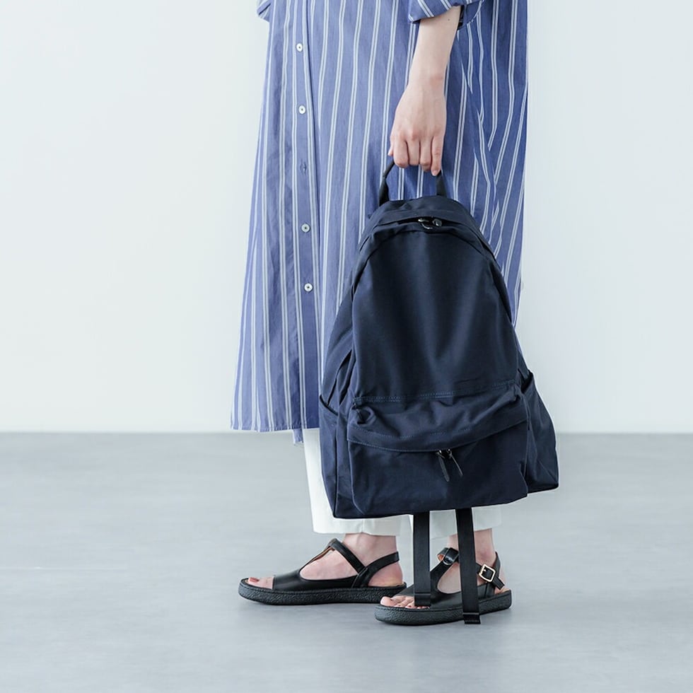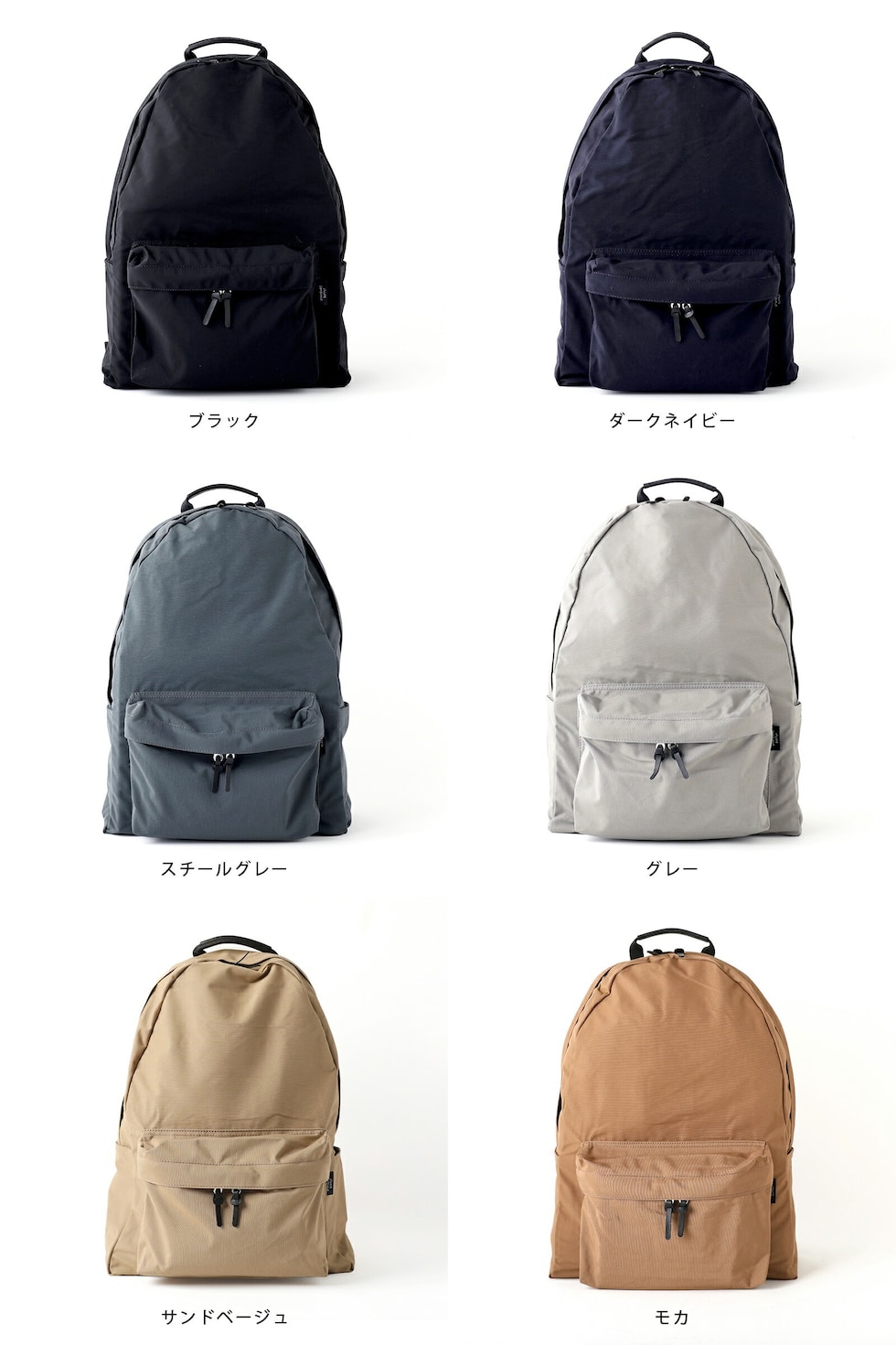 メイン素材には発色が綺麗なコットン60%、ナイロン40%の64N/Cクロスを使用。表面に撥水加工を施し、裏面にはアクリル加工をかけコシ感が出るように仕上げています。くたっとやわらかく、シワ、折れ目などを、目と手で感じる事のできる表情のある素材が、シンプルなデイパックにあたたかな温度と表情を与えてくれています。